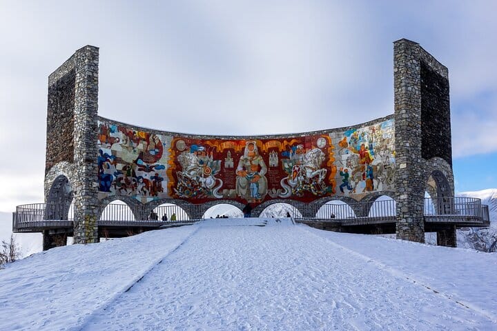 Explore the stunning Kazbegi region on a full-day tour with a professional guide. Travel comfortably by mini-bus as you discover highlights like Zhinvali Reservoir, Ananuri Fortress, the Black and White Aragvi rivers, Gudauri monument, and the iconic Gergeti Trinity Church in Kazbegi. Along the way, enjoy local dishes and taste authentic mountain honey for a true Georgian experience.